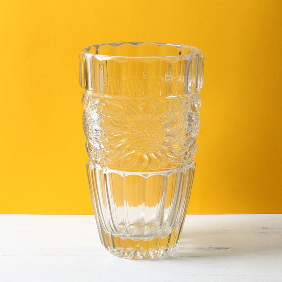 Large Vintage Sunflower Clear Pressed Glass Vase / Bohemia Glass / Glass Union / Heřmanova Huť / Czech Republic / 1960s.