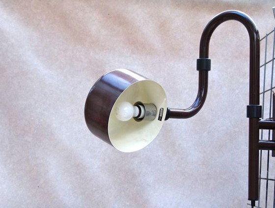 A large wall lamp produced by the Dutch company Gepo around 1970. The lamp has a dark brown shade and a white interior.