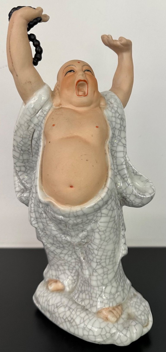 This vintage porcelain figurine depicts Budai, the Laughing Buddha, as a jovial, bald monk with a raised arms and an open mouth in mid-laugh. His generous belly and blissful expression radiate happiness, abundance, and contentment. Crafted from ceramic bisque, the piece features a distinctive white robe finished with a delicate crackle glaze, creating a web of fine lines that enhances its antique charm. Traditionally a feng shui talisman for good fortune, this smiling figure is best placed facing the front door to welcome prosperity and joyful energy into the home.