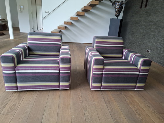 Laura Meroni is known for its excellent quality of fabrics and high-quality seating comfort. These 2 club chairs are done in the typical Laura Meroni stripes...where it all once started.... Perfect condition, perfect seating comfort and Italian beauty.