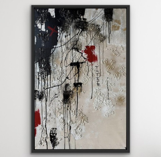 Discover the expressive power of "Grito Manuscrito XL" by renowned artist Laura Pinchete. This abstract artwork, executed on canvas, captures the essence of emotion and movement in a bold composition of black, red, white, and gold hues. The texture and dynamism of the brushstrokes invite a deeper exploration of the underlying themes and feelings.