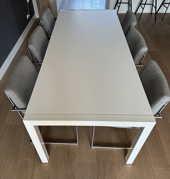 This dining table by Laurens Fisher, designed by Paul Visser, features a white Color Core top with a powder-coated stainless steel frame.
