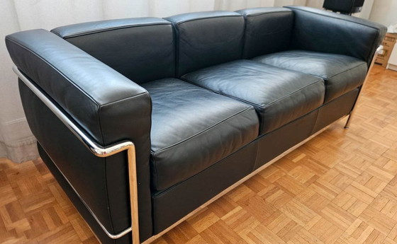 LC2 sofa by Le Corbusier, Pierre Jeanneret, and Charlotte Perriand for Cassina – Dimensions: Width: 180 cm, Depth: 70 cm, Height: 67 cm - seat height 50 cm. Black leather and metal frame. Signed. Removable and washable cushions. Very comfortable. Cassina edition in black leather. Serial number engraved and Cassina signature on the frame. Very good condition. Collection only, Paris 12th arrondissement — no delivery