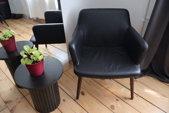 Bolia C3 Armchairs are a stylish and modern piece, perfect for any contemporary living space. Crafted with high-quality black leather and supported by sturdy wooden legs, it offers both comfort and durability. The sleek design and neutral colors make it a versatile addition to any room. Ideal for relaxing or entertaining guests, this armchair combines elegance with functionality.