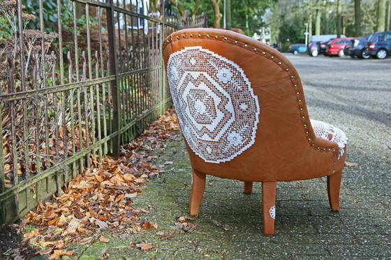 Leather classic bombed armchair with hook and lace work. The legs are also upholstered. Midcentury. Many also see this as a knitting chair