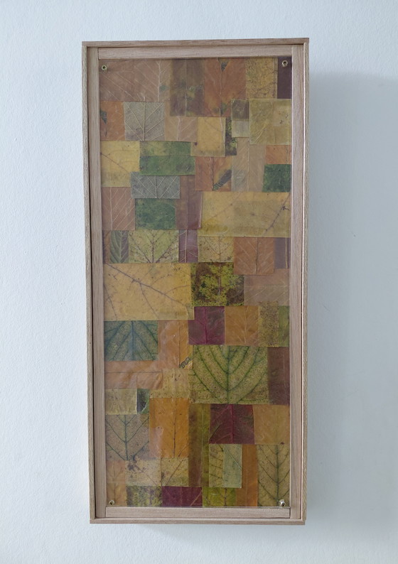 This unique artwork captures the essence of autumn with a beautiful mosaic of dried leaves in warm shades of green, yellow, brown, and orange. The wooden frame adds a touch of rustic charm, making it a perfect fit for both modern and classic interiors.