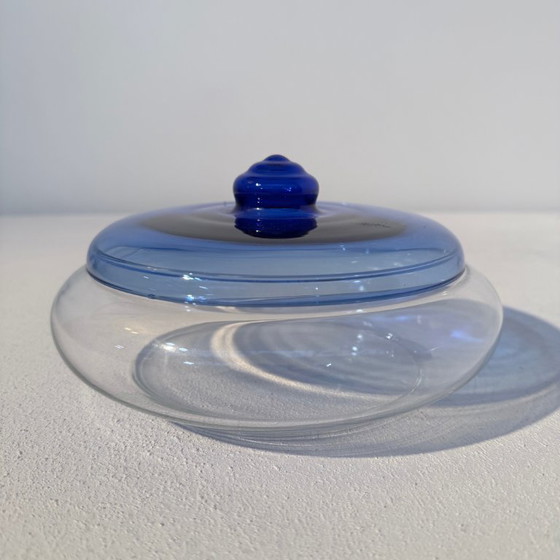 Leerdam cookie box, designed by Jacques Boon/Floris Meydam. Both made this type of cookie box. The cookie box is made of glass with a bright blue lid. In very good condition.