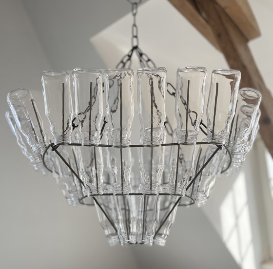 A striking glass chandelier with a twist. Instead of glass or crystal ornaments, the designer used milk bottles to make the light sparkle.