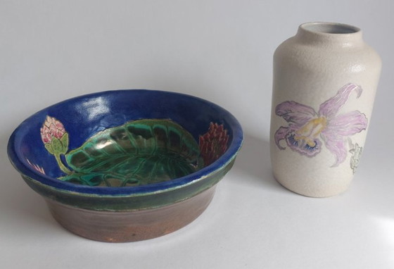 Discover the refined elegance of this beautiful earthenware vase and bowl, designed by the renowned artist Leo Muysken (1907-1984). With its delicate floral motifs and rich color palette, this set embodies Muysken's artistic vision and adds a touch of sophistication to any interior. The vase is subtly decorated with a graceful orchid, while the bowl displays a vibrant scene of water lilies, both with exceptional attention to detail and use of color.