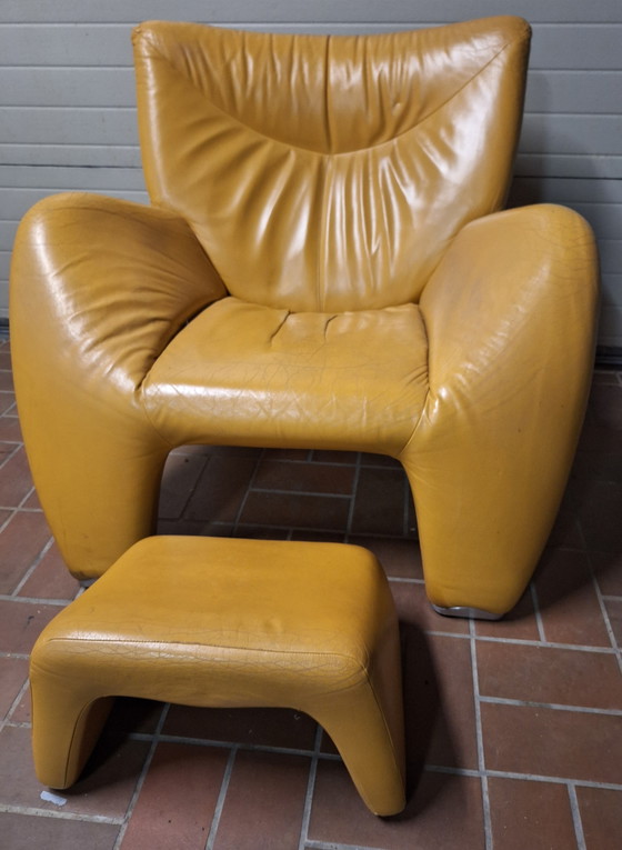 Lovely sitting leather Leolux Echnaton armchair with under the chair (matching) hocker. Design by Jan Armgardt. Through use leather craquelé (patina) but no cracks or the like.