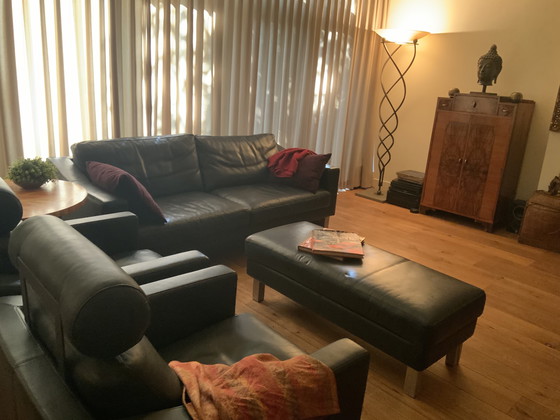 Beautiful Leolux Antonia Royale designer sofa in dark blue (almost black). Complete set consisting of a 3-seater sofa, 2 armchairs, a 2-seater ottoman/footstool, and 2 headrests. The set is in excellent condition, as good as new! The seams are perfect, see photos.