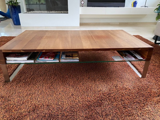 Stylish Leolux cherry wood coffee table, perfect for a modern interior. Featuring a glass top for magazines, this table offers both functionality and elegance. Dimensions: 73 cm wide, 135 cm long, 35 cm high.