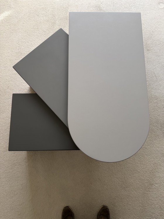 Leolux coffee table consisting of three sections that can be compactly tucked underneath each other. Each section has a different shade of gray. The table has some signs of wear but still looks very usable.