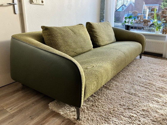 Beautiful Leolux Elias 3.5-seater sofa in green. It's a combination of green melange fabric and green leather.