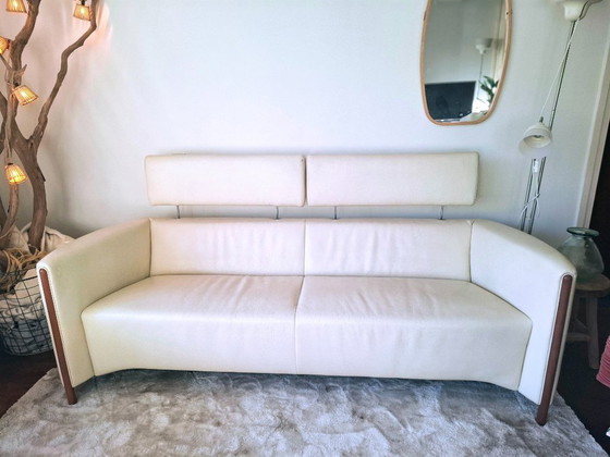 This heavy-duty sofa is upholstered in high-quality cream-colored leather, features two adjustable (removable) headrests, walnut legs, and accents on the armrests.