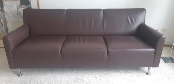 Leolux/ Rooby leather 3-seater sofa in good condition. Design by: Hugo de Ruiter. Comfortable seating.Beautiful supple brown/eggplant leather. Lxwxh = 194x69x78cm Seat height= 42cm Seat depth = 55cm