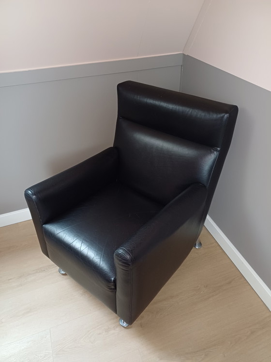 Beautiful, well maintained, timeless black leather armchair/chair with poof type "Rooby" by Leolux. Approximately 15 years old. The chair has been in the attic for 4 years without being sat on. It is time to give it a new owner. The interior and foam of the seat are really still perfect. The leather has always been well maintained and with a little polish on the armrest it looks perfect again.