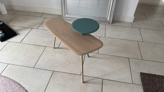 Leolux two-tone side table. Large top in M4000 white matte oak stain. Small top in turquoise.