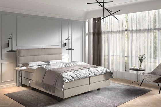 A timeless model available in 6 beautiful basic colors, including a headboard with upholstered vertical stripes matching the bed. Supplied as standard in the size 180 x 210 cm. The back of the headboard is also upholstered, making this bed perfect for freestanding placement. A set of side panels can be ordered as an option and can also widen the headboard.