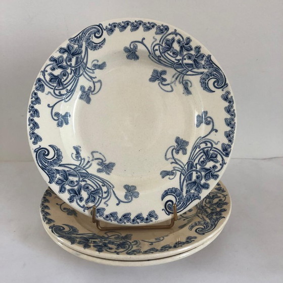Set of two Terre de Fer porcelain soup plates from the Clairefontaine faience factory, Violette model. The initials LG are those of Léon Graves, who headed the factory between 1894 and 1913.
