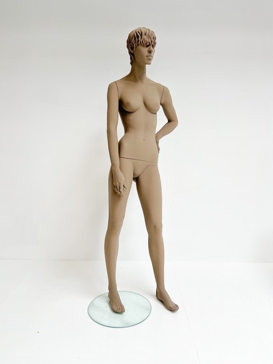 Produced in the 1980s in Zaventem, Belgium. This unique mannequin is of very high quality. Made of heavy polyester, including the unique locks of hair. The mannequin is in good condition. The gray paint has worn off in a few places. The mannequin stands on a glass plate. A wonderful vintage item for the home, office, restaurant, or shop.