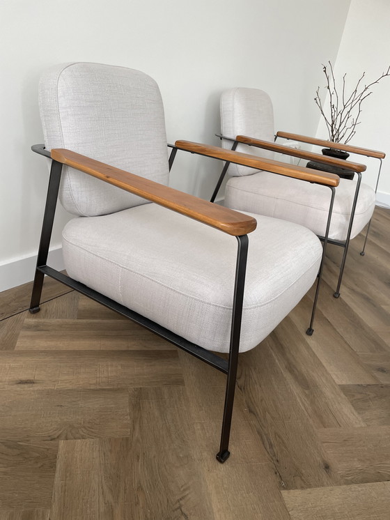 These light gray armchairs feature a modern design with a combination of fabric upholstery, wooden armrests and a sturdy metal frame. They offer a comfortable seating experience and are perfect for any modern living space. Thanks to the neutral color palette, they fit seamlessly into a variety of interior styles. One chair is slightly discolored due to stain removal.