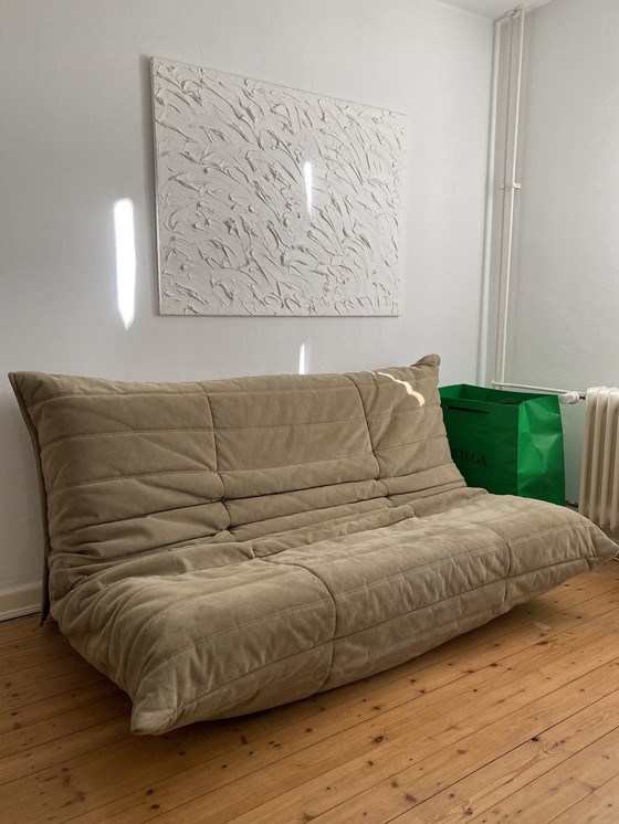 Rare vintage Ligne Roset sofa bed in beige/taupe Alcantara fabric.