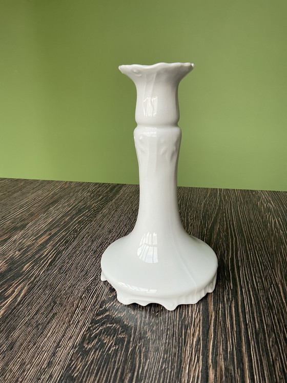 White porcelain candlestick from Limoges, France, the quality region for high-end porcelain. Beautiful finish with relief details. Ideal as a table decoration.