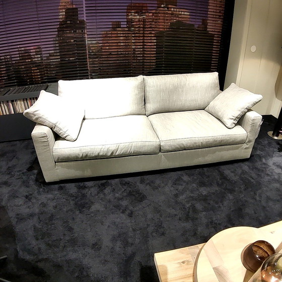 Linteloo Fabio 3-seater sofa This 3-seater Fabio by Linteloo has the characteristic comfortable seating that Linteloo is so famous for. Truly a sofa you sit IN. The seat and back cushions are reversible so you don't have to constantly plump the filling. The arm cushions are included. The sofa is upholstered in Pisa-301, the legs are a mocca color. Dimensions: 230x105x82 cm. The fabric is a bit thin in some places. This is actually difficult to see in the photo.