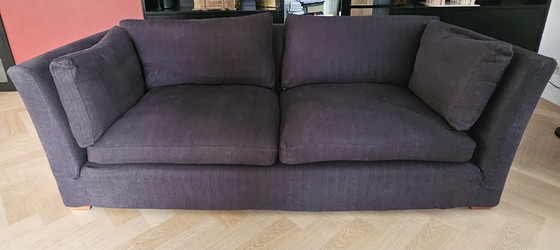 Beautiful St. Louis sofa from Linteloo, including a matching ottoman. The sofa is modern, sleek, and in excellent condition. It has always been well-maintained and was completely reupholstered five years ago. This is an ideal opportunity to acquire a stylish designer sofa without paying the high retail price. It's important to note that the photo shows the clear base fabric as stained, but this is due to the shadow in the photo. It is actually completely clean.