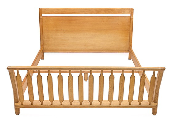 Oak 2-seater bed by Guillerme et Chambron. For 190×140 cm box spring. Traditional assembly with dowels and inserted bolts. Very good condition. Circa 1950