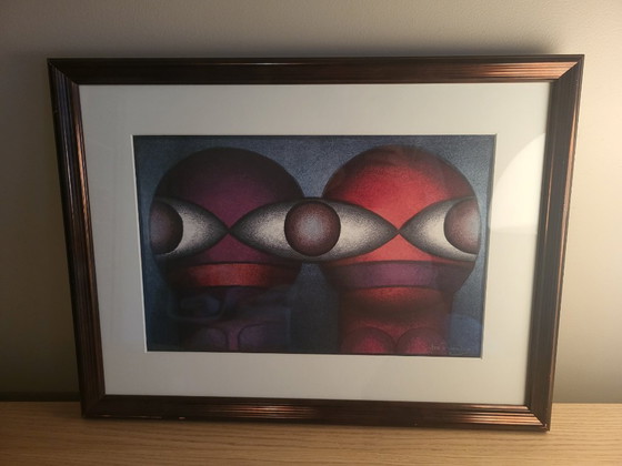- This lithograph presents a captivating composition of two figures, using rich hues of red and purple, framed in a brown wood frame that accentuates its elegant appearance.