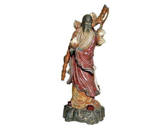 Impressive vintage Lladro oriental sage Shou Xing porcelain figurine. It features his most recognisable identity, his pronounced bald head and long beard. He carries the Peach of Immortality in one hand and a crooked staff of peach tree branch in his other hand. The statues of Shouxing are popular birthday gift for loved ones. Finely crafted in limited edition by Lladró, known for luxury porcelain figurines, handmade in Spain circa 1980's. In very good condition with minimal traces of wear and other details consistent to age and artisan craftsmanship. Kindly refer to the images as integral part of the description. (W9.23171)