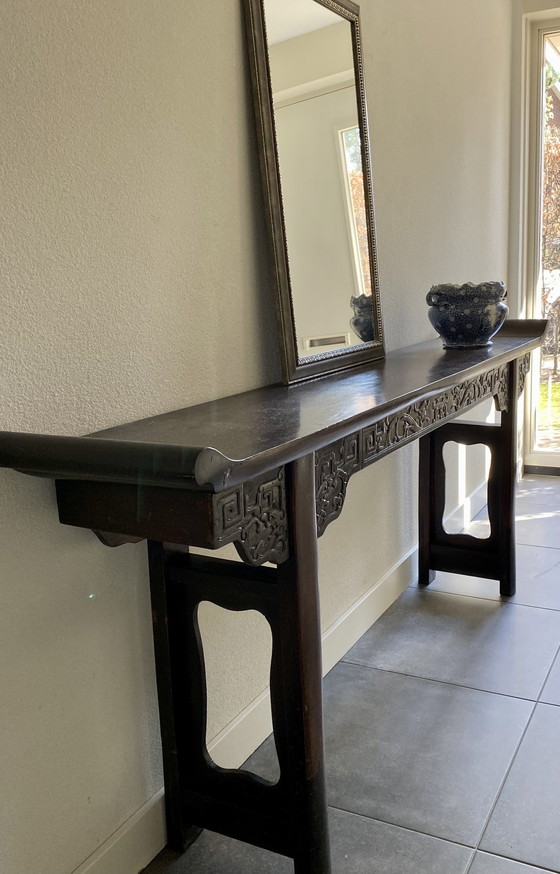 Beautiful, solid wood altar table with subtle hand-carved woodwork. Due to its length and appearance, this is a real eye-catcher in any interior.
