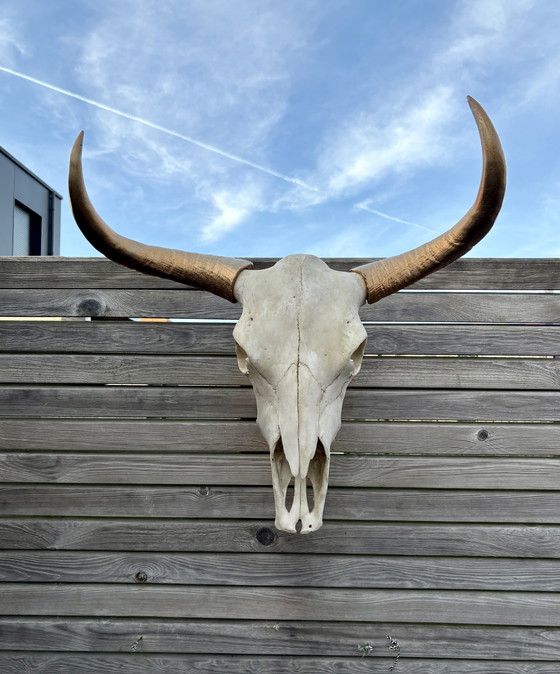 Introducing a striking Longhorn XXL skull, a captivating piece that brings a touch of the wild into your home. This authentic skull features real horns and a complete set of teeth, offering a genuine and natural aesthetic that is sure to be a conversation starter.