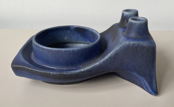 Discover the unique charm of this rare Brutalist planter/duo solifleur vase, designed by Matt Camps for Loré Beesel. With its striking blue ceramic finish and bold shapes, this piece is a real eye-catcher in any interior.