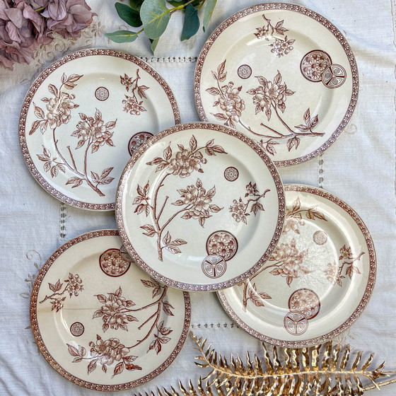 Bring a touch of period elegance to your table with this magnificent set of 5 large brown earthenware plates, dating from 1880-1890. Created for the prestigious Grand Dépôt, founded by Émile Bourgeois in Paris in 1862, these plates feature a delicate floral motif and geometric disks rare for this type of service.