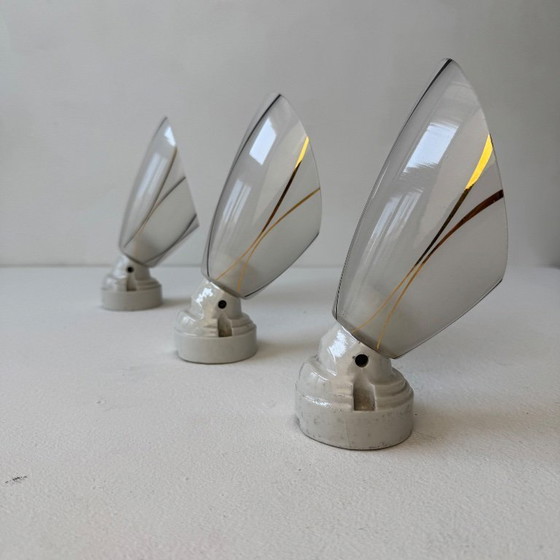 Set of 3 vintage ceramic wall lights with decorated glass shades. Circa 1950. Rewired. Terminal block connection. Brass bayonet socket (B22 bulb) Base diameter: 6.5 cm Shade diameter: 10 cm Shade height: 15 cm Cover distance: 21.5 cm Weight: 1.2 kg Table lamp, articulated lamp, desk lamp, wall lamp, pendant light, ceiling light, vintage, garage, portable lamp, opaline glass, Clichy glass, industrial lamp, accordion lamp, zip-zag lamp, gooseneck, factory workshop, industrial, Fresnel lens, Arlus, Cremer, Kaiser Idell, Jumo, Gras Ravel Clamart, Jielde Holophane, Sanfil, Solere, Kandem, Mazda, Midgard, Perriand, Le Corbusier, Singer, Hala, Luxo, Bauhaus, Schaco, Super chrome, WALL LIGHTS, ART DECO LIGHTS, FACTORY LAMP, SCONCES, DESK LAMP, FACTORY SCISSOR LAMP