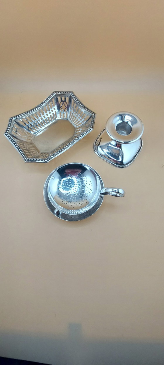 Discover this refined set of silver-plated accessories, consisting of an elegant candlestick, a graceful small dish, and a functional tea strainer. These timeless pieces add a touch of classic charm to any interior and are perfect for both everyday use and special occasions. The glossy finish and detailed design make this set a valuable addition to your collection.