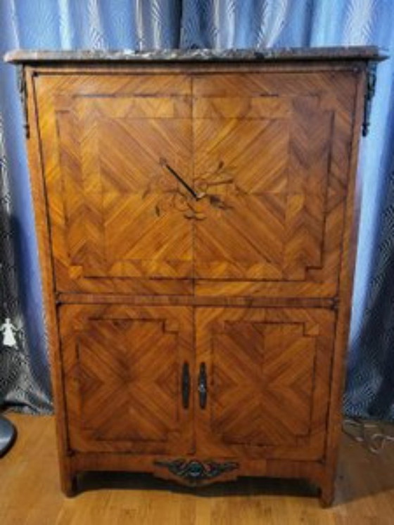 Piece of furniture made of several types of wood in the Louis XVI style, covered with a marble plaque and sculpted bronze finishes.