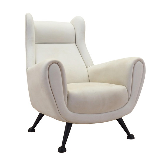 The armchair was made in the 1980s, Italian manufacture. The legs are made of metal. The armchair is covered with original, high quality aniline leather in white. A second identical armchair is also available in our offer - together they will create a unique set. Condition: Original upholstery with visible signs of use, stains and dirt. Larger signs of use are always shown in the photos. Product ready to use. Technical data height: 99 cm width: 84 cm depth: 90 cm seat height: 40 cm seat dimensions: 46 x 50 cm