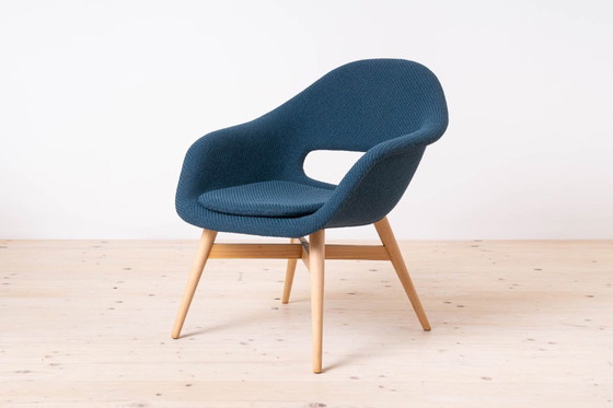 This funky Lounge Chair, a timeless piece, was designed by renowned Czech designer Miroslav Navrátil in the 1950s. Crafted in the Czech Republic, this iconic chair showcases a flawless fusion of style and comfort. It features fiberglass seating shell and wooden base. The shell is well and ergonomically shaped and provides high comfort. The wooden base has been renovated and refinished with oil that gave it a natural finishing touch. The seating was reupholstered with premium fabric from the esteemed Danish brand Kvadrat, adding a contemporary flair to its classic design. The fabric was designed by Norway Says, it combines a graphic, textured surface and sophisticated colors to very lively effect: from a distance it appears monochrome, but when seen from closer up it reveals a second color. Bring this colorful funky object to your interior to enhance your daily comfort and experience aesthetic joy.