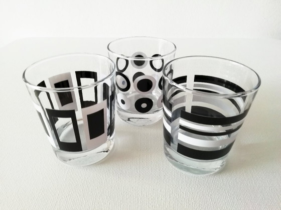Set of three vintage black and white geometric lowball or whiskey glasses called Godis, from Ikea. Designed by Henrik Preutz. From the 1980s. In excellent condition. Space Age, postmodernism. Dimensions: diameter 8 cm, height 9.5 cm.