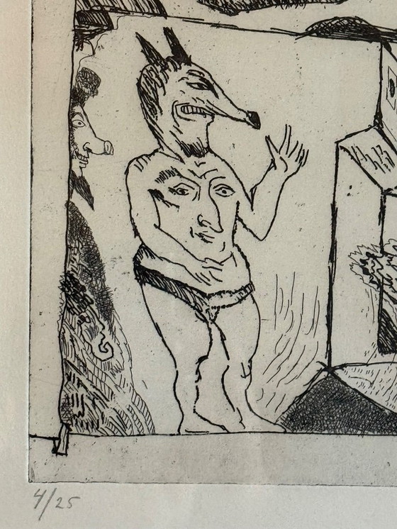 A unique etching by Lucebert, a masterpiece from 1991 that beautifully captures the artist's expressive style. This etching, numbered 4/25, is signed by the artist, making it a unique collector's item.
