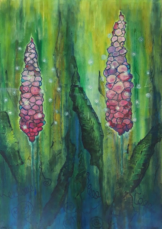 Discover the mysterious beauty of "Luciferum mysteriosum." This abstract canvas artwork captures the essence of mysterious light bearers in vibrant green and pink hues. Perfect for modern art lovers looking to add a touch of mystery to their space. Be inspired by the unique shapes and colors that tell a story. Oil on canvas.