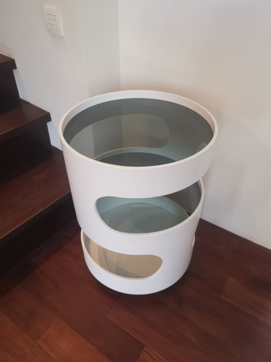 Side table on casters in white lacquered wood with 2 circular tops in lightly tinted glass. Model Luna (N°6586) by German company Opal Mobler. In addition to the 2 upper glass trays, a third white lacquered wooden tray at the bottom of the unit completes the set. A small, practical piece of furniture with attractive, organic, typically vintage shapes. 4 fully functional castors. Excellent overall condition, both in terms of the wooden structure and the 2 glass tops.