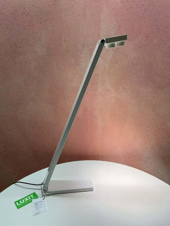 The Luxit Top Four table lamp combines modern design with functional lighting. This elegant lamp, designed by Alberto Basaglia and Natalia Rota Nodari, is a stylish addition to any desk.