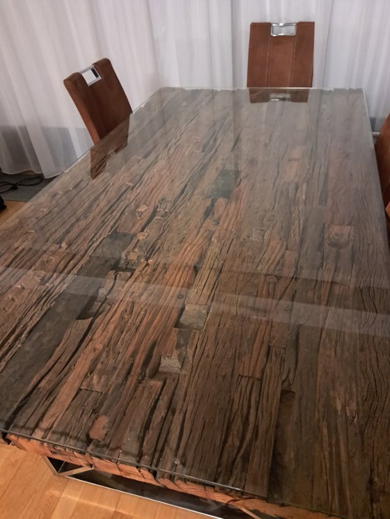 - The table features a unique wooden surface, protected by a glass top, ensuring durability and a sophisticated look.