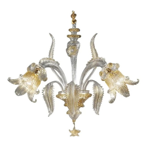 Impressive handmade Murano glass chandelier with 6 arms. Bath of gold metal frame. L.48cm Height 50cm Sp 30cm / L. 19” H. 20” Sp 12”.