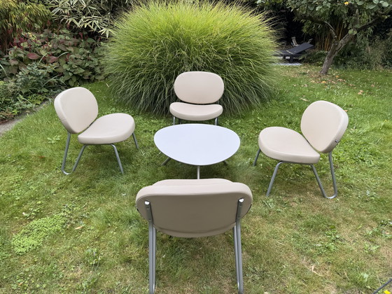 Transform your dining or meeting room with this beautiful set of four designer armchairs from the Italian brand Sitland, designed by Montaggio. Retro style. This set, consisting of four comfortable chairs and a matching table, is the perfect blend of style and functionality.